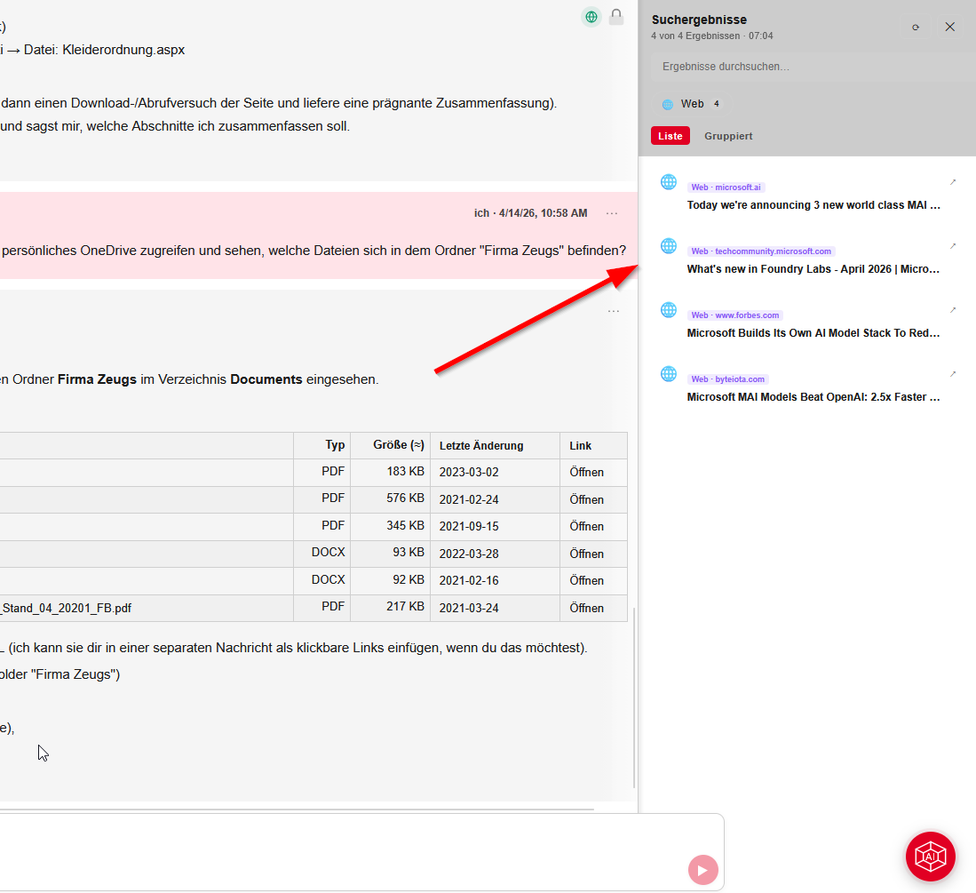 Gefundene Ergebnisse aus Datenquellen erscheinen im Enterprise-Ergebnisse-Panel rechts im Chat.
