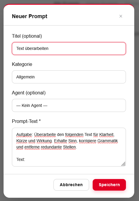 Prompts sind gespeicherte Eingabevorlagen, die Sie wiederverwenden können. Sie können entweder im Prompt-Katalog oder direkt aus einer eigenen Chat-Nachricht via Kontextmenü (Drei Punkte) erstellt werden.