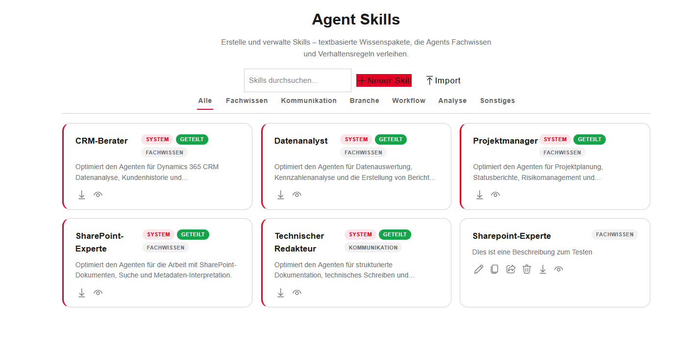 Export als .skill.md-Datei, Import per Dateiauswahl, Duplizieren möglich.