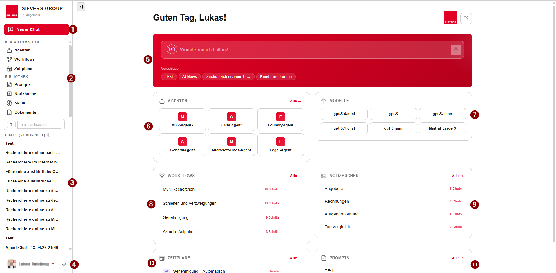 - Der zentrale KI-Assistent: Hier können Sie in der Regel alle Ihre Anfragen eingeben. Diese werden vom zentralen KI-Assistent orchestriert und an die passenden Agenten weitergeleitet. Wenn Sie das nicht möchten, starten Sie manuell einen neuen Chat via Neuer Chat oder mit Klick auf ein spezifisches Modell oder einen Agenten