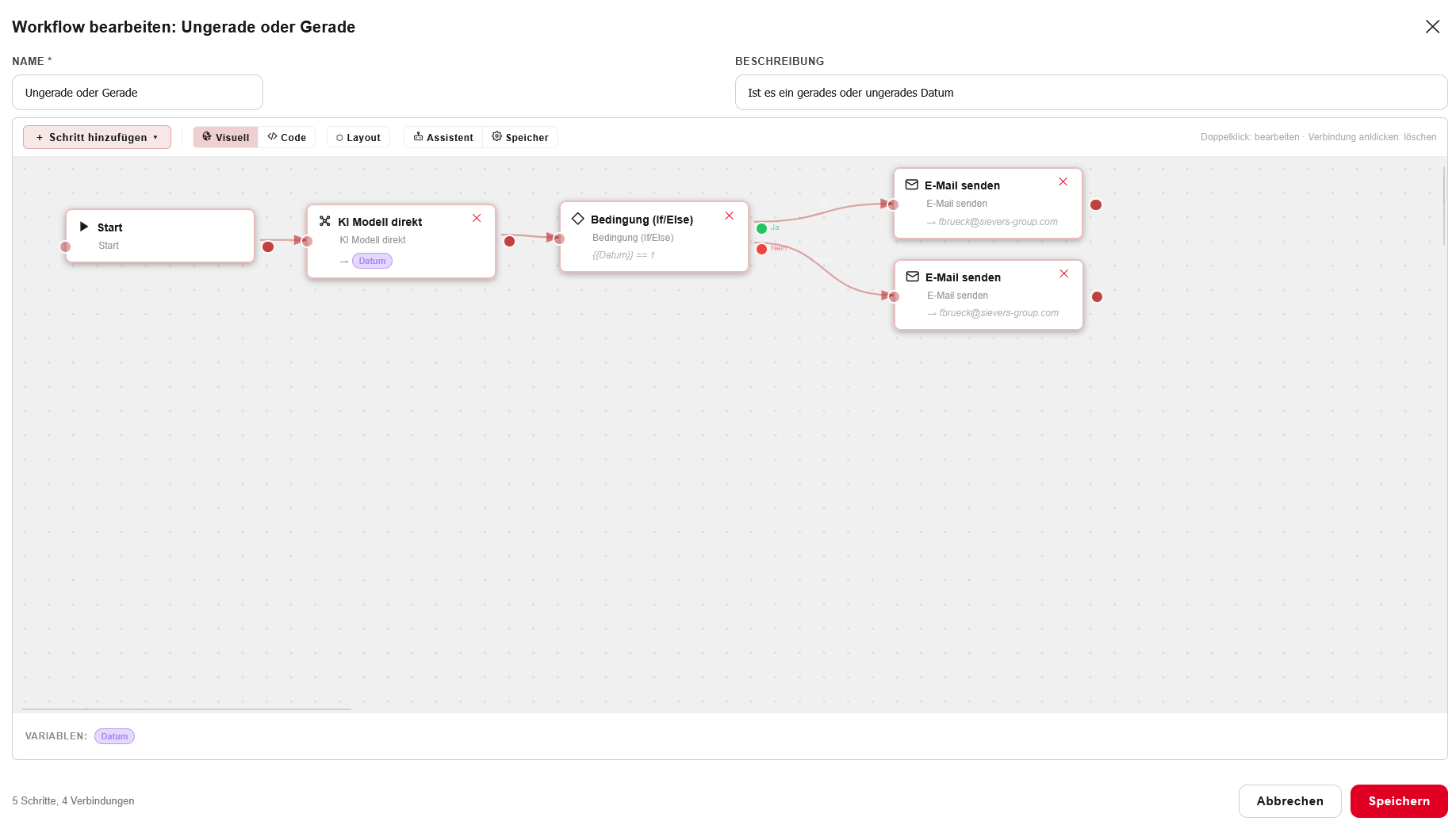 Ein eigener Workflow wird aus einzelnen Schritten zusammengesetzt, die Sie über Schritt hinzufügen einfügen können. Verbinden Sie anschließend die einzelnen Schritte, indem Sie eine Linie zwischen den roten Übergabepunkten ziehen.