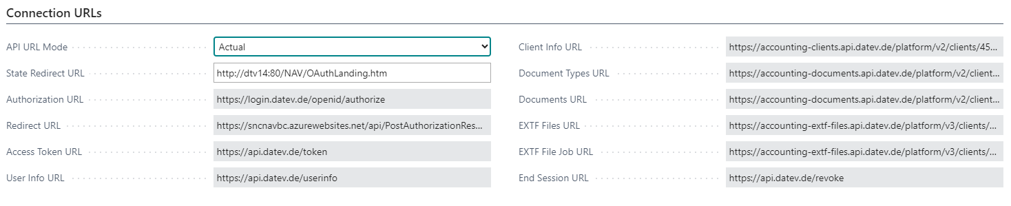 In the DATEV Buchungsdatenservice setup, you can also view all connection URLs and customize the State redirect URL as you wish. However, you must first make this section visible. To do this, select the Display connection URLs action in the menu.