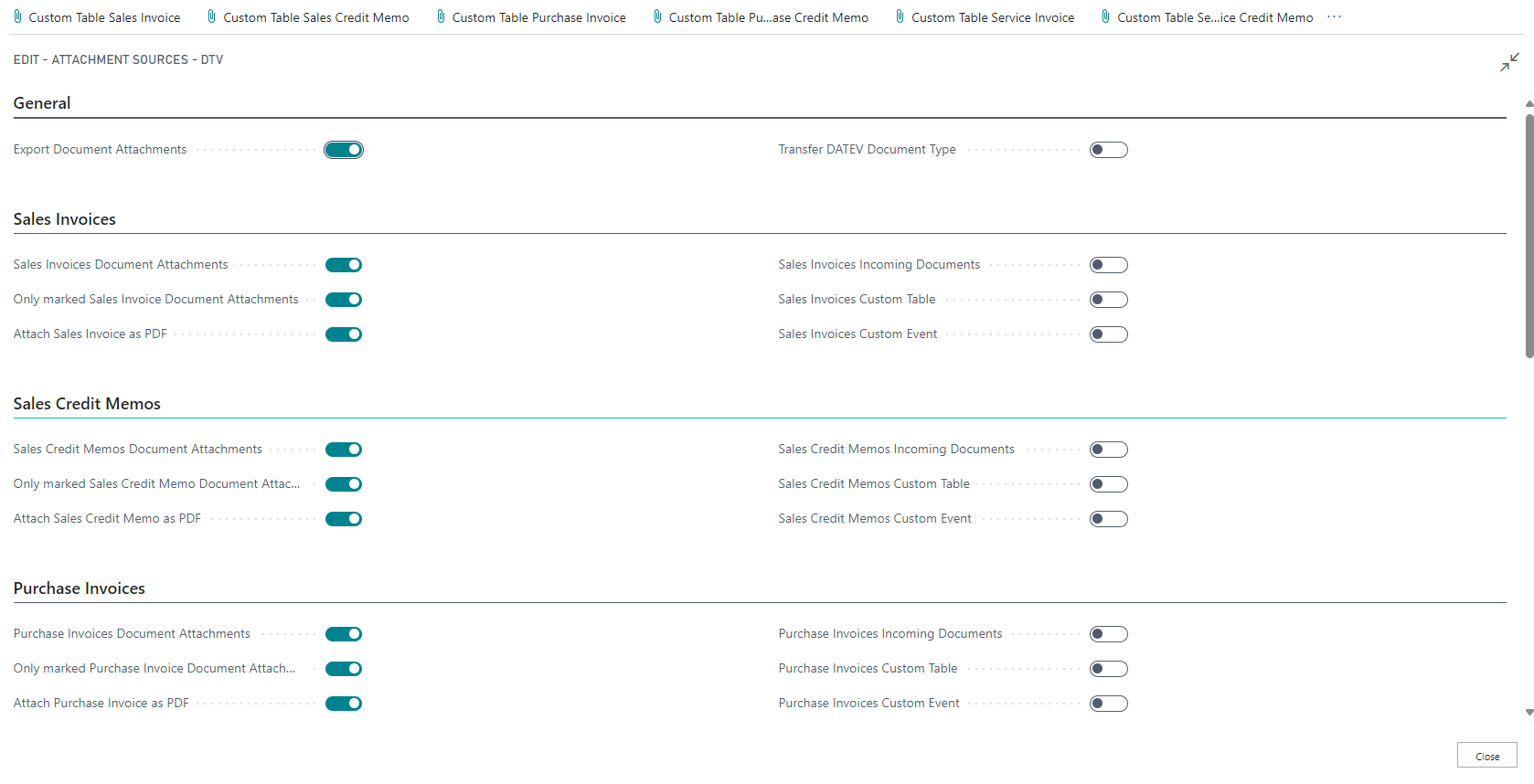 In general, all switches can be set for a document. As soon as an attachment is found in the form of a PDF file, it will be used for export. As described above, the order of checking the BC tables is first the document attachments, then the incoming documents, then the custom table and then the custom event.