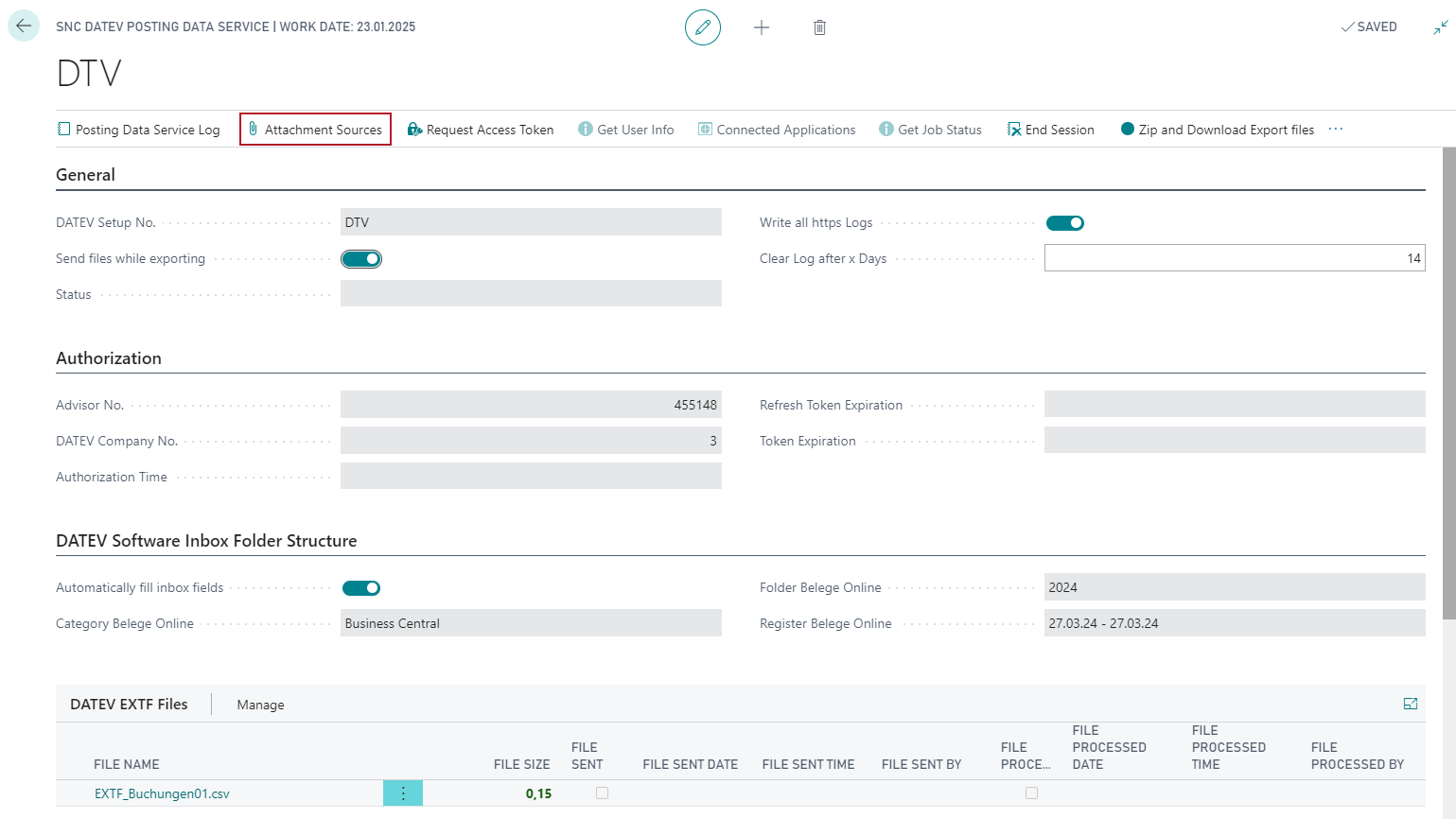 The setup takes place on the page SIEVERS DATEV Posting Data Service in business central.