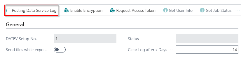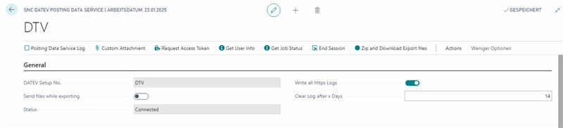 - Clear Log after x Days: Specifies after how many days the log data will be deleted. Zero days: The log will never be deleted automatically. Otherwise a minimum of 14 days is expected by DATEV eG. You can find further information about the log in the section Service Log.