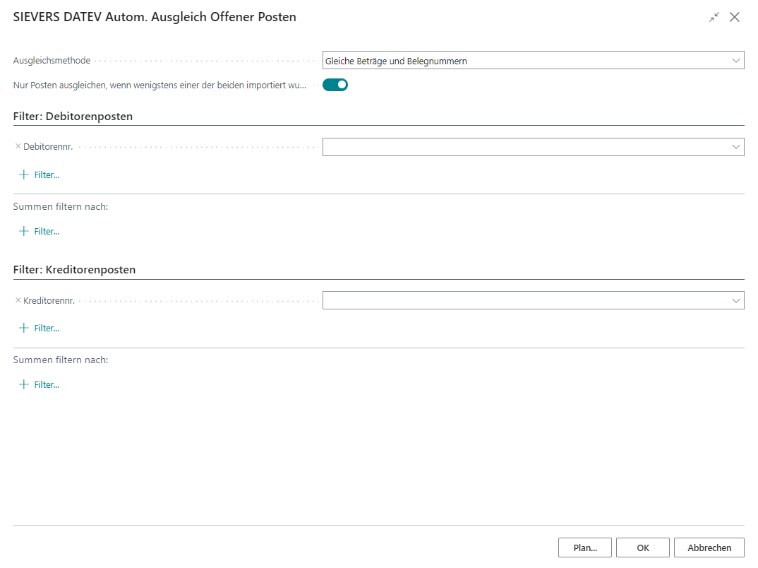 Wird diese Funktion ohne gesetzte Filter ausgeführt, erfolgt ein Ausgleich aller offenen Posten wie vorstehend beschrieben, unabhängig davon, ob die offenen Posten importiert oder direkt in Dynamics NAV/Business Central gebucht wurden.