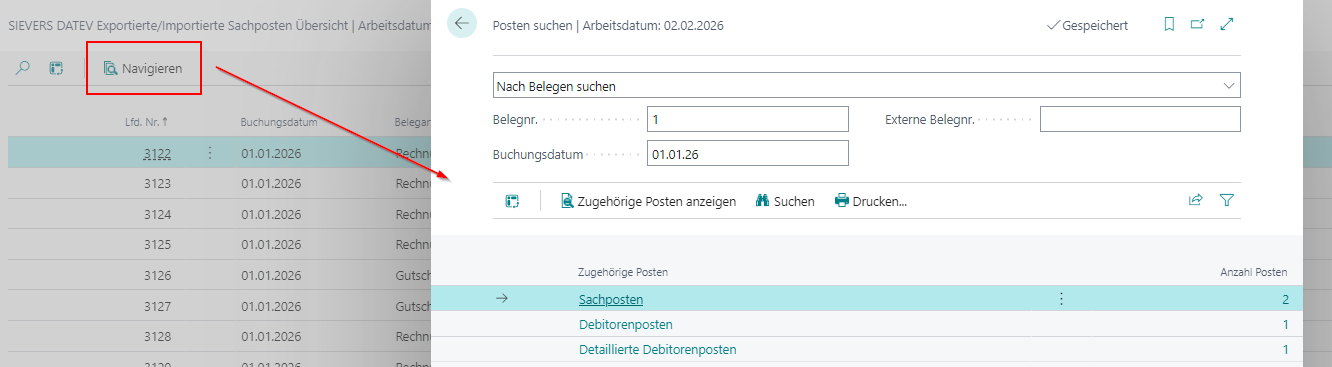 Über "Navigieren" werden Ihnen, wie im NAV- und BC-Standard, alle zugehörigen Posten zu der markierten Zeile angezeigt.