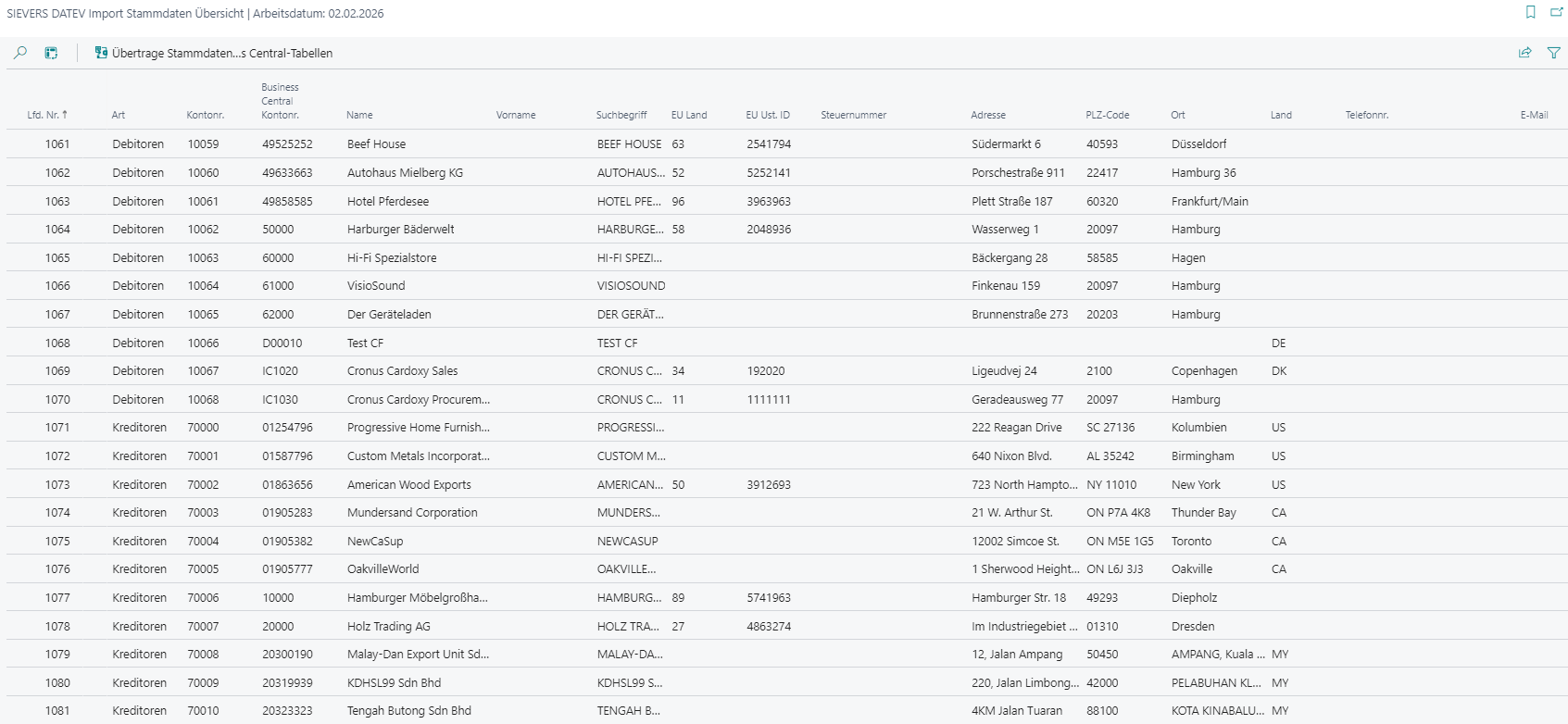 Die folgenden Bilder zeigen die Darstellung der zusätzlichen Tabelle "SIEVERS DATEV Import Stammdaten Übersicht" mit reimportierten Stammdaten aus dem CRONUS-Mandanten.