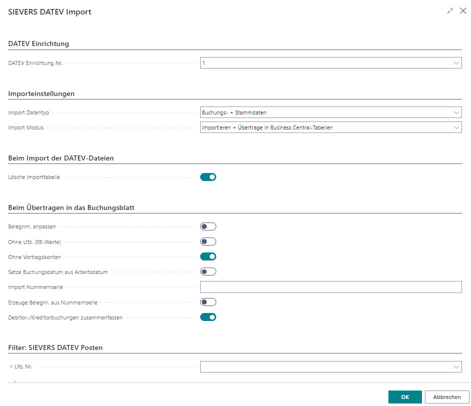 Je nach gewähltem "Import Modus" wird die Funktion "Übertrage in Business Central-Tabellen" automatsich mit ausgeführt oder erfolgt manuell im nächsten Schritt über die "SIEVERS DATEV Einrichtung Karte" oder über die "SIEVERS DATEV Importposten Übersicht".
