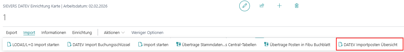 Die "SIEVERS DATEV Importposten Übersicht" kann über die "SIEVERS DATEV Einrichtung Karte" oder über die Suche in Business Central aufgerufen werden.