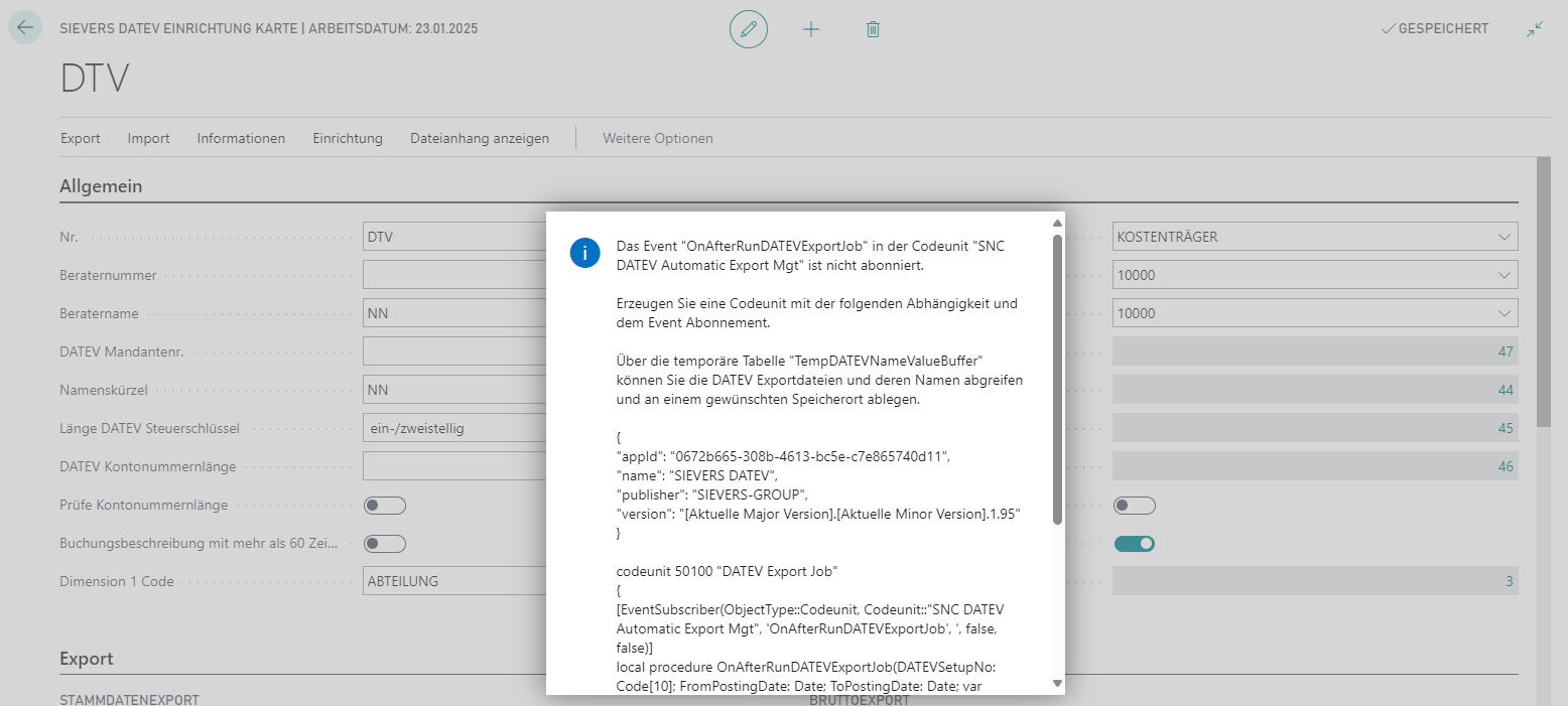 [EventSubscriber(ObjectType::Codeunit, Codeunit::"SIEVERS DATEV Automatic Export Mgt", 'OnAfterRunDATEVExportJob', '', false, false)]