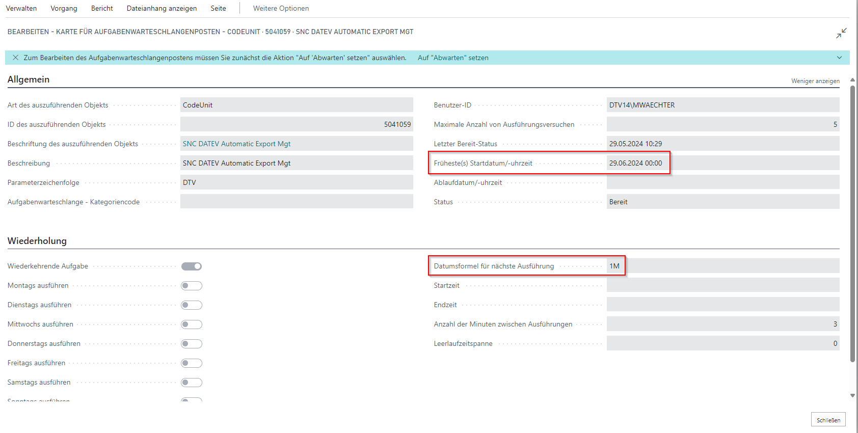 Nach einem erfolgreichen Durchlauf stellt die Aufgabenwarteschlange den frühesten Startzeitpunkt automatisch auf das nächste Datum, welches sich durch die Datumsformel ergibt.
