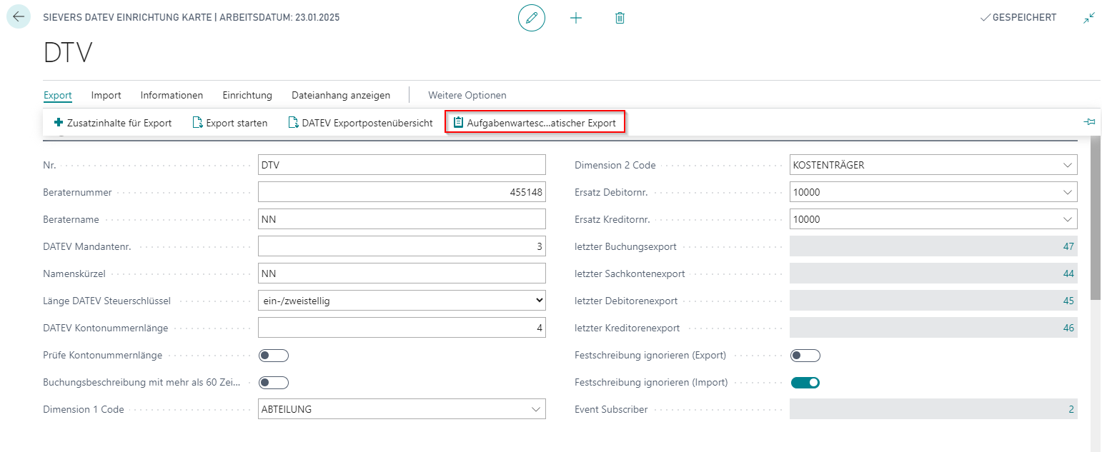Mit dem automatischen Export lässt sich der Export der SIEVERS DATEV Schnittstelle über eine einzurichtende Aufgabenwarteschlange automatisieren. So können die Dateien im Hintergrund über eine Datumsformel zu einem bestimmten Zeitpunkt erzeugt werden, durch ein Event abgegriffen und durch eine individuell durchzuführende Programmierung am gewünschten Speicherort des Kunden abgelegt werden.