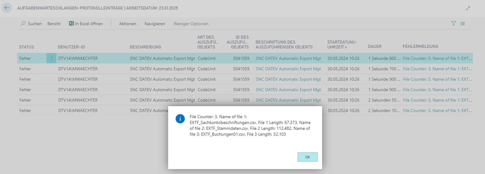 Nach Korrektur der Einrichtung und Neustart der Aufgabenwarteschlange konnte der Export erfolgreich ausgeführt werden.