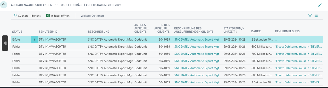 Die Aufgabenwarteschlange erzeugt bei einem Durchlauf Protokolleinträge. Diese müssen regelmäßig gemonitored werden, damit ein Eingriff im Fehlerfall möglich ist.