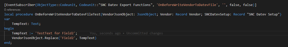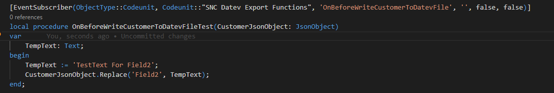 [EventSubscriber(ObjectType::Codeunit, Codeunit::"SIEVERS DATEV Export Functions", 'OnBeforeWriteExportEntryToDatevFile', '', false, false)]