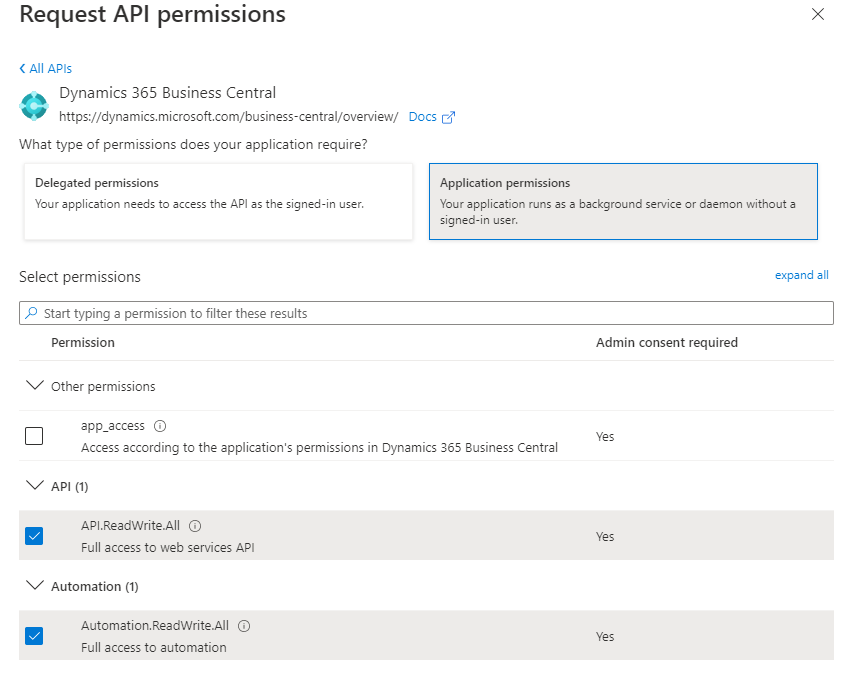 In den API Permissions muss der Service nun berechtigt werden, Daten aus der Business Central-API zu erhalten. Fügen Sie hierzu mit Add a permission eine neue Berechtigung zu.