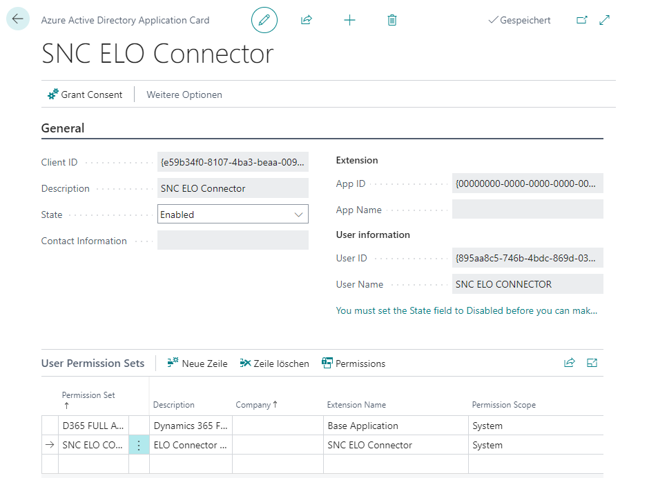 Weisen Sie dem Service anschließend noch die User Permission Sets D365 FULL ACCESS und SIEVERS ELO Con AD zu.