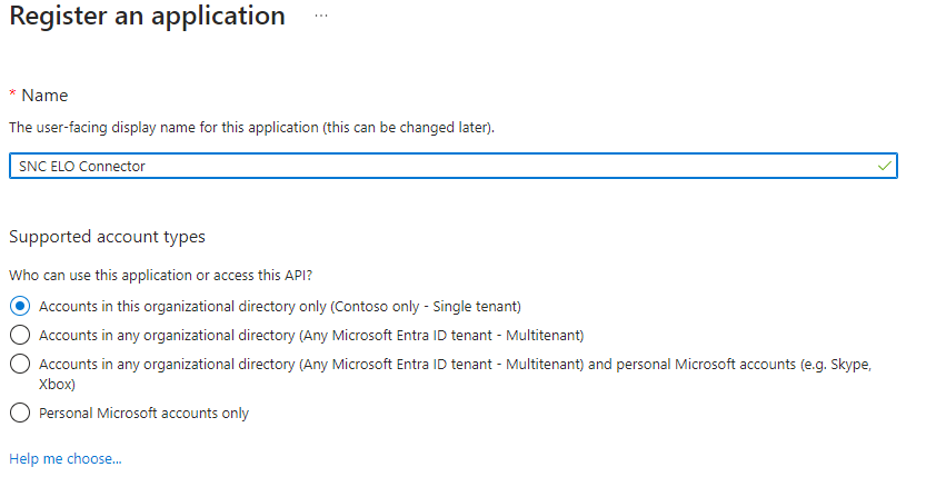 Geben Sie der App einen Namen, zum Beispiel SIEVERS ELO Connector. Stellen Sie außerdem sicher, dass im Abschnitt Supported account types die erste Option Accounts in this organizational directory only ausgewählt ist.