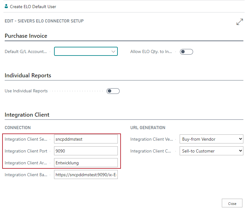 With SIEVERS ELO you can conveniently display files that have been stored in ELO via the Integration Client. You can find out more about this in the section Integration Client. In the SIEVERS ELO setup you will find the three fields required to set up the URL to the ELO Integration Client.