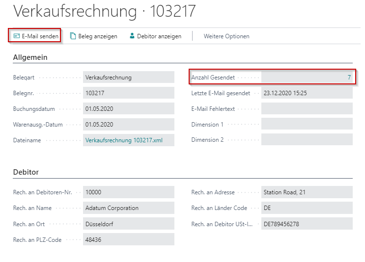 Falls in einem Beleg eine Kontakt-E-Mail steht, wird die E-Rechnung an diesen Kontakt gesendet. Ansonsten wird die reguläre Debitoren-E-Mail genutzt.