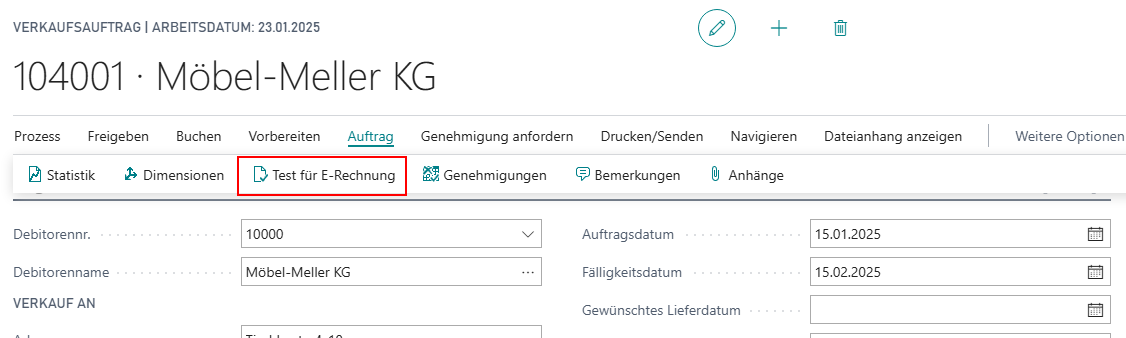 Über Auftrag kann ein Test für E-Rechnung durchgeführt werden. Wenn notwendige Pflichtfelder fehlen, wird ein Protokolleintrag erzeugt und nach dem Test das Protokoll angezeigt. Dieser Test wird auch automatisch vor jeder Faktura-Buchung durchgeführt.