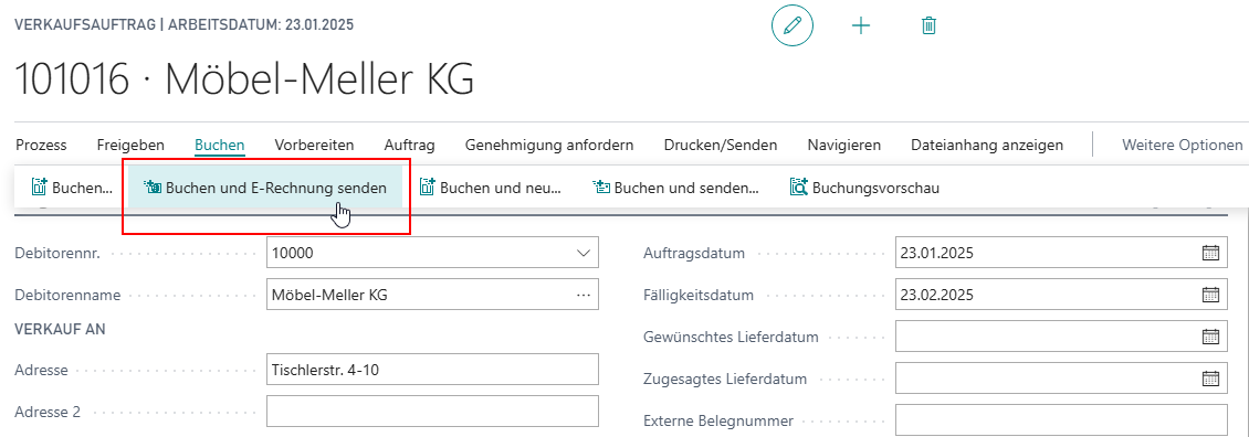 Wurden keine Fehler erkannt, kann der Auftrag gebucht werden. Hierzu gibt es unter Buchen die Funktion Buchen und E-Rechnung senden mit der die Buchung des Belegs und der Versand einer E-Mail mit der zum Standard E-Rechnung konformen Datei in einer Aktion erfolgt.