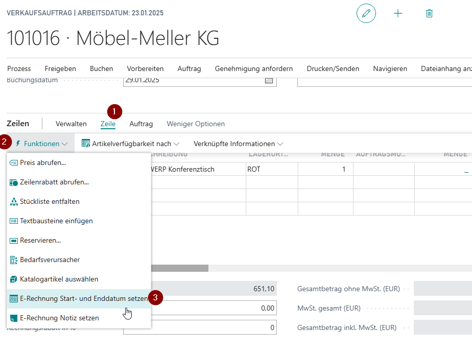 Die Eingabe von Start- und Enddatum ist nur direkt über die Zeilen möglich, wenn Sie BC14 oder neuer bzw. ein AL-System benutzen. Bei älteren Systemen oder BC14 C/AL muss die Zeilenfunktion E-Rechnung Start- und Enddatum setzen benutzt werden. Das hat technische Gründe