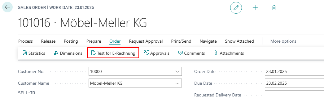You can execute a Test for E-Rechnung via Order. If mandatory fields are missing a log entry will be generated and displayed after the test. This test is also carried out automatically before each invoice posting.