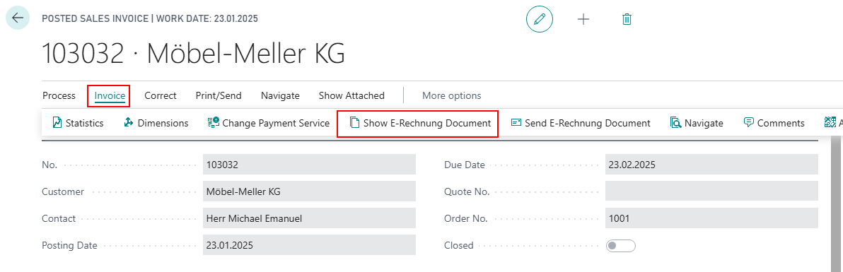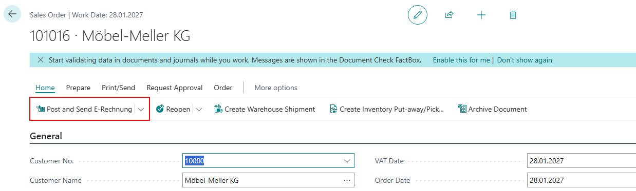 You can also use this procedure for a sales invoice, credit memo or service invoice or credit memo and generate and send an XML file that conforms to the standard E-Rechnung.