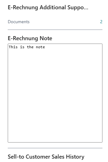On the right side in the Details area you will find the E-Rechnung Note. Here you can store further information to be written into the XML file. Note that the characters "<", ">" and "&" are not allowed.