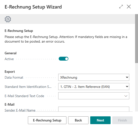 In the first step of the setup wizard, activate the functionality for generating e-invoices by clicking the Active button. You can also select the default data format, specify the search order for standard item identification, enter a default e-mail text code, and decide for sales invoices and credit notes as well as service invoices and credit notes whether lines with zero amounts should be exported. In addition, you can also define an e-mail sender here. For more information about these fields, see the section E-Rechnung Setup. There are also other setup fields for alternative tax codes.