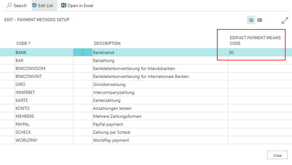 The goal of the next step is the assignment of your payment methods deposited in Microsoft Dynamics 365 Business Central to the UN/ECE 4461 codes required by XRechnung.