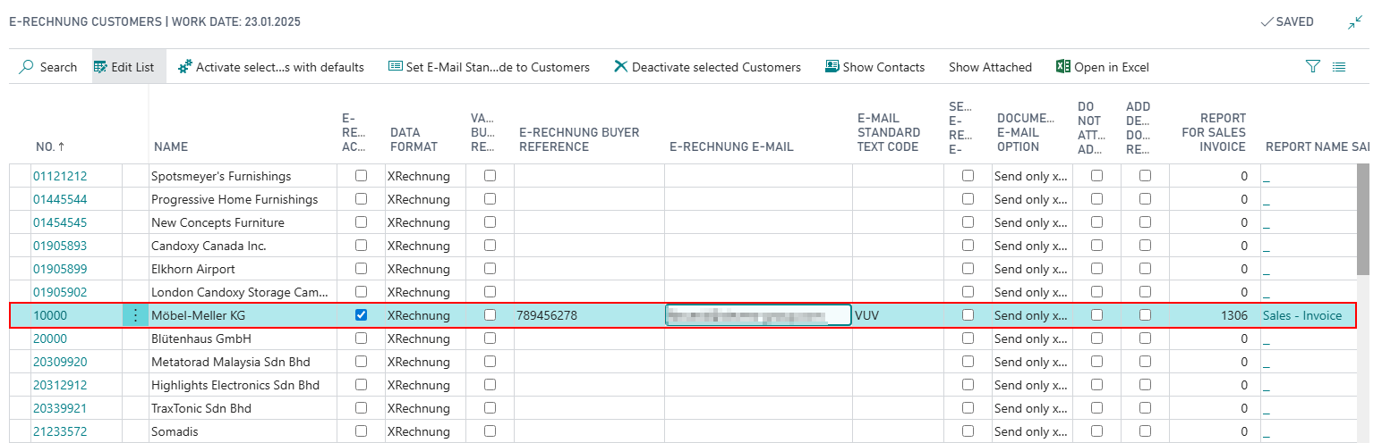 To get a better overview for which customers/vendors SIEVERS E-Rechnung is active, you can add the field E-Rechnung Active to the customer/vendor list via Personalize. The field is also displayed in the document overviews such as the sales order list.