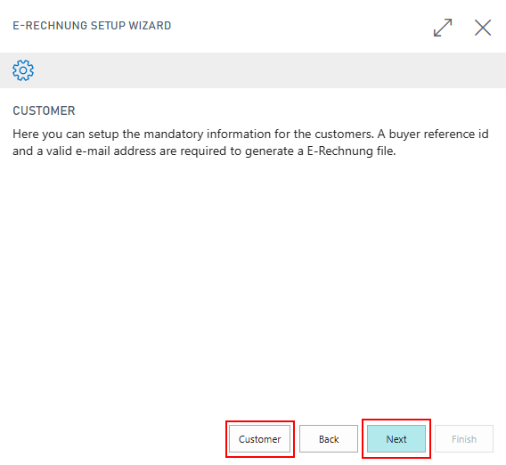 If you completed the setup steps regarding the customers and vendors you can close the overview and proceed to the next step with Next. If you want to make subsequent E-Rechnung settings to customers or vendors, you will find them on the customer/vendor card in the E-Rechnung tab. For vendors, this tab is only visible if the Use Self Billing option is activated in the E-Rechnung Setup.