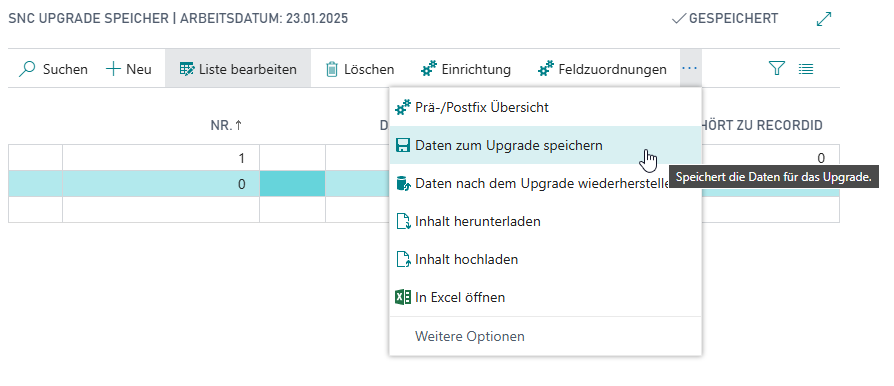 - Öffnen Sie nun die Seite SNC Upgrade Speicher und wählen Sie über das Menü Daten zum Upgrade speichern.