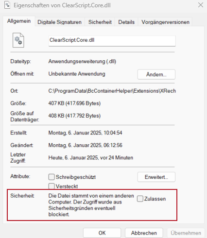 Es kann sein, dass Windows den Zugriff auf die heruntergeladenen Dateien automatisch blockiert. Falls es hierbei Fehler gibt, kontrollieren Sie bitte, ob bei den Dateieigenschaften im Tab Allgemein der Haken bei Zulassen im Abschnitt Sicherheit gesetzt ist.