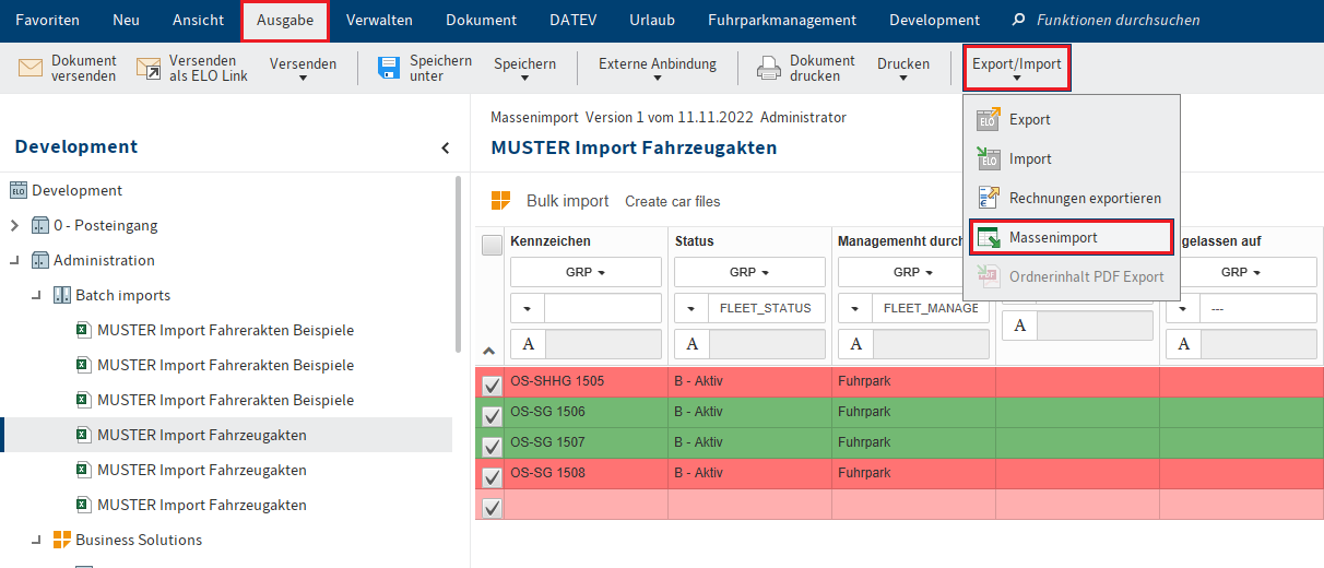 Über die Schaltfläche "Massenimport", kann der Massenimport gestartet werden. Diese Schaltfläche ist unter Ausgabe -> Export/Import -> Massenimport zu finden.