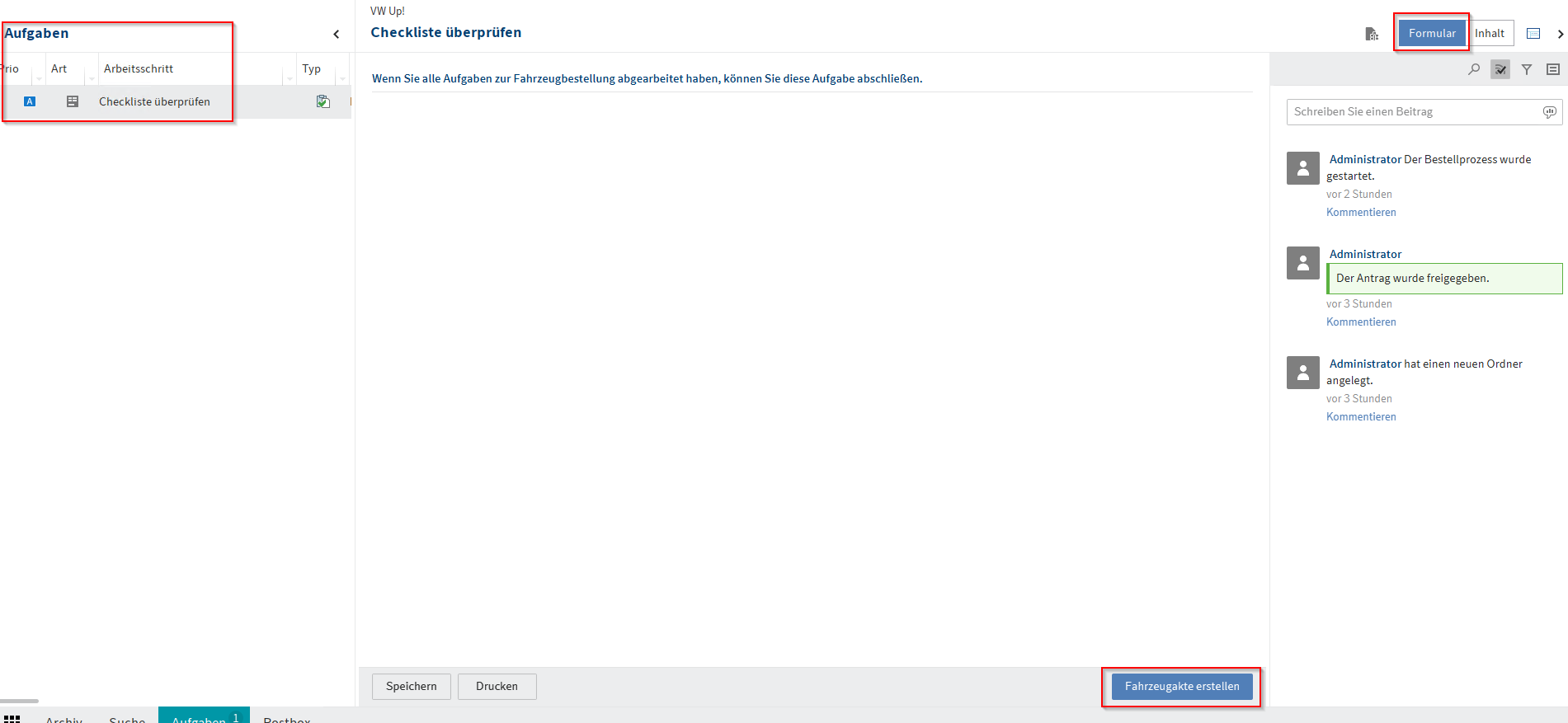 - Haben Sie die Aufgaben-Checkliste fertiggestellt, können Sie über Formular die Checkliste abschicken und die Bestellung einleiten. Nun bekommt das Fuhrparkmanagement nochmal die Checkliste - nur diesmal zum Abarbeiten. Ist die Checkliste fertig bearbeitet, kann über Formular die Fahrzeugakte erstellt werden. Diese erhält das Fuhrparkmanagement per Aufgabe.