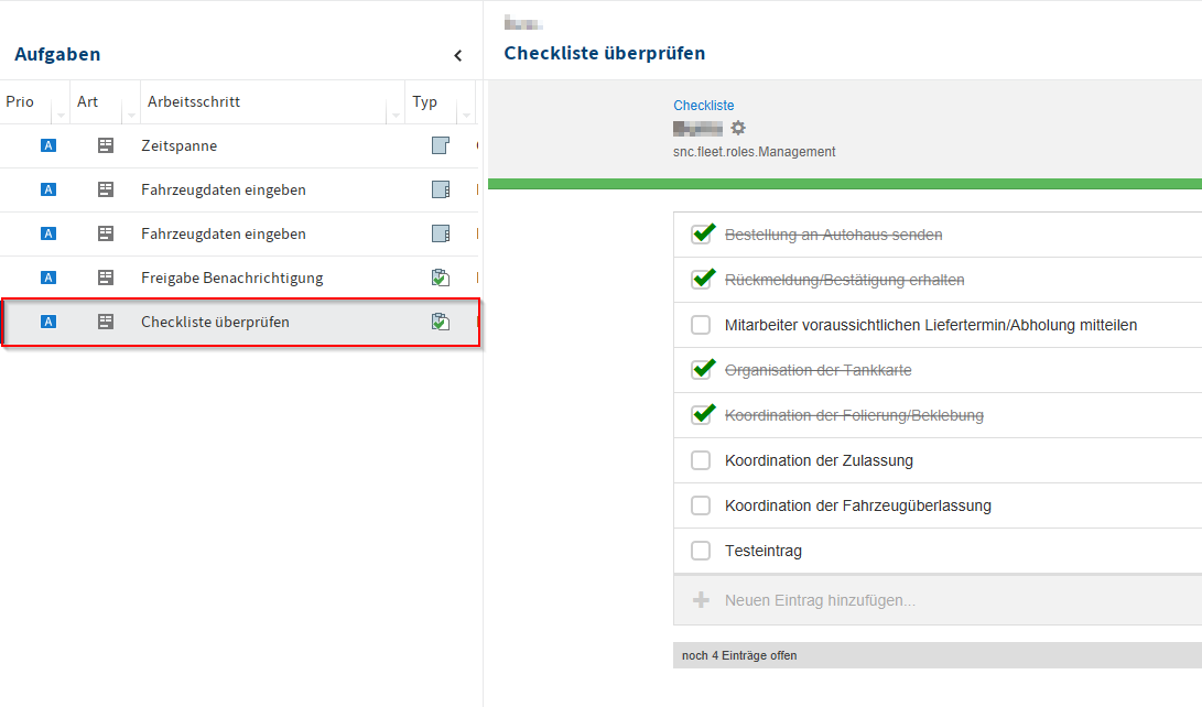 Das Fuhrparkmanagement bekommt nun einen Workflow mit einer Checkliste. In dieser Checkliste befindet sich eine Reihe von Aufgaben. Hier können Sie auch neue Aufgaben hinzufügen.