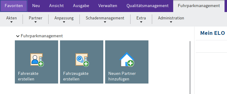 Diese Funktionen finden Sie entweder als Startseite auf der Kachel oder im Tab Fuhrparkmanagement