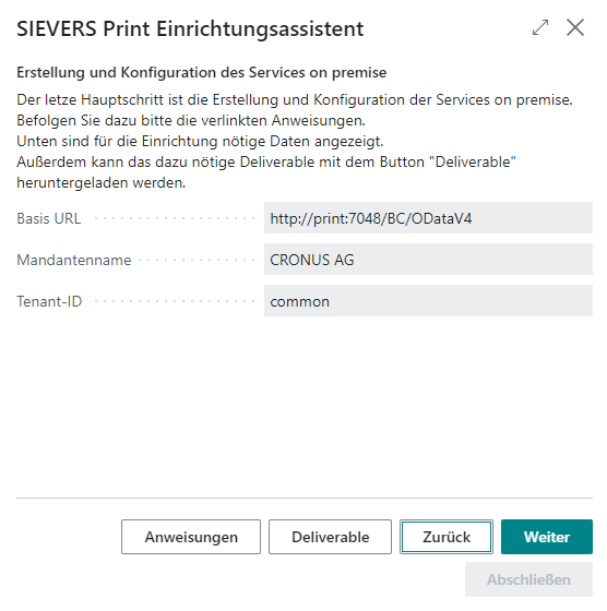 Die Einrichtung von SIEVERS Print auf Business Central ist hiermit fertiggestellt. Zuletzt werden Ihnen noch ein paar Daten angezeigt, die für die weitere Einrichtung notwendig sind. Die brauchen Sie im Schritt Unternehmen bei der onPrem-Einrichtung des Services.