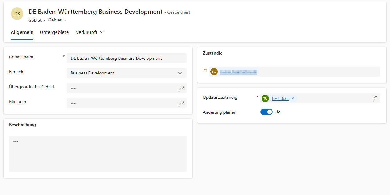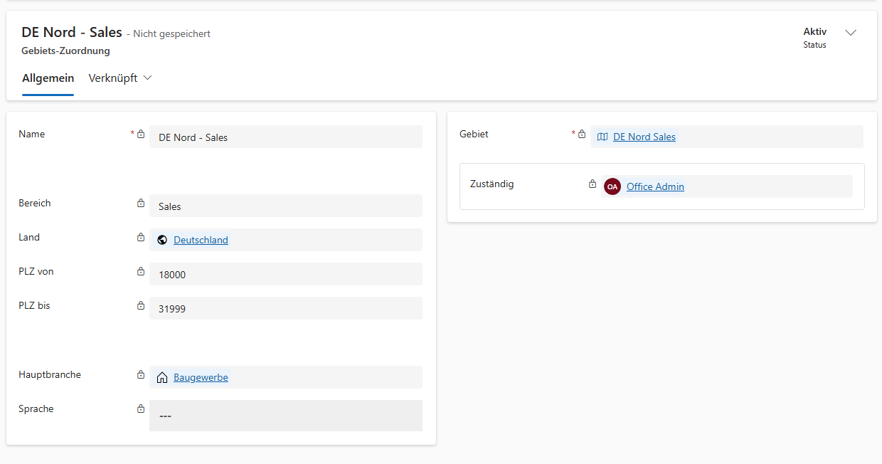 Diese Seite entspricht der normalen Vertriebsgebiete-Seite. Erstellen Sie ein neues Gebiet mit einem Gebietsnamen und ordnen Sie es dann einer Person im Bereich Zuständig zu.