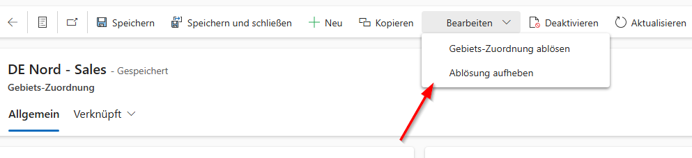 Wenn Gebiets-Zuordnungen einmal aktiv sind, sind sie nicht direkt veränderbar. Sie müssen entweder über Kopieren eine Kopie dieses Datensatzes erstellen, den Sie anpassen können, oder Sie führen die Aktion Gebiets-Zuordnung ablösen aus. Bei beiden wird die Zuordnung auf Abgelöst gestellt, sobald die neue Zuordnung aktiviert wird.