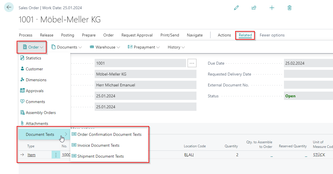 If you did not activate the Insert automatically into documents option when creating a document text, you will have to add it manually. To do this, open the corresponding document. Via More options -> Related -> Document type (e.g. order) you will find the tab Document texts.