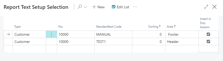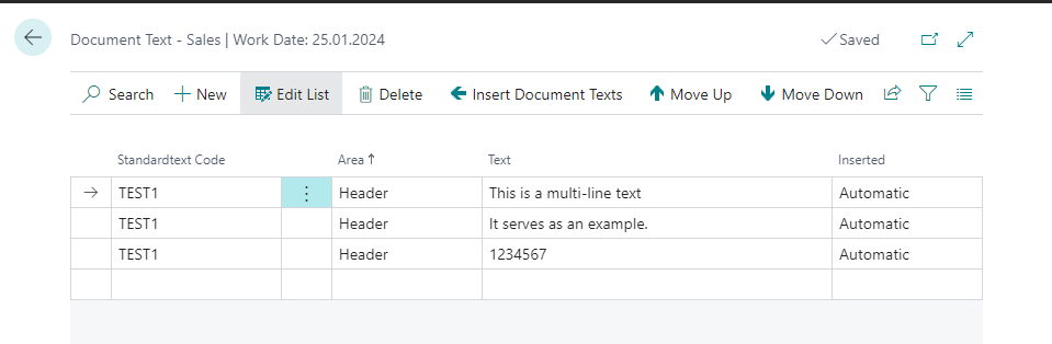 Here you can select from the document texts for the respective document. Now a table opens, in which the document texts currently inserted in this document are displayed.