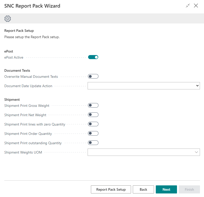 The document texts are set up at this point. If you want to set up document texts, open the setup via Setup Report Pack Texts.