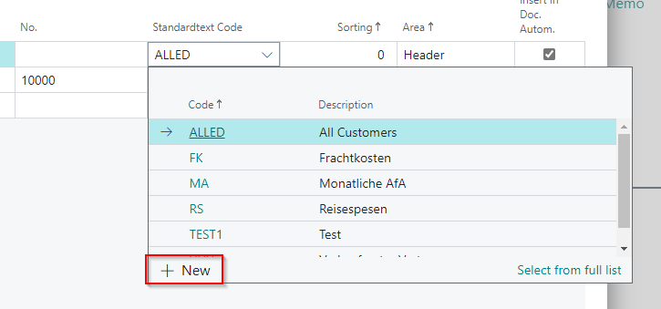 To create the actual document text, you need to create a new Standard Text. To do this, click in a Standard Text Code field and select New.