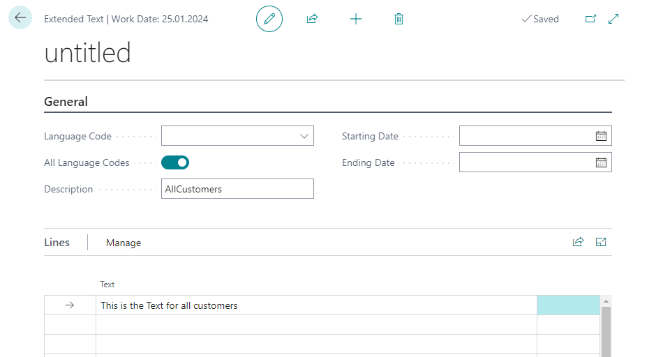 Then enter the desired code and a description in an empty line. Now while you still have selected the line you can open the Extended Texts page. This is a page of the BC standard.