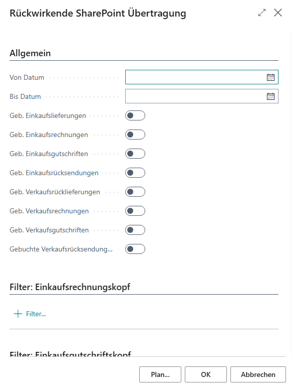 If you are implementing the SharePoint Connector retrospectively, you may want to archive all documents that have already been posted. Batch processing of posted documents is available for this purpose.
